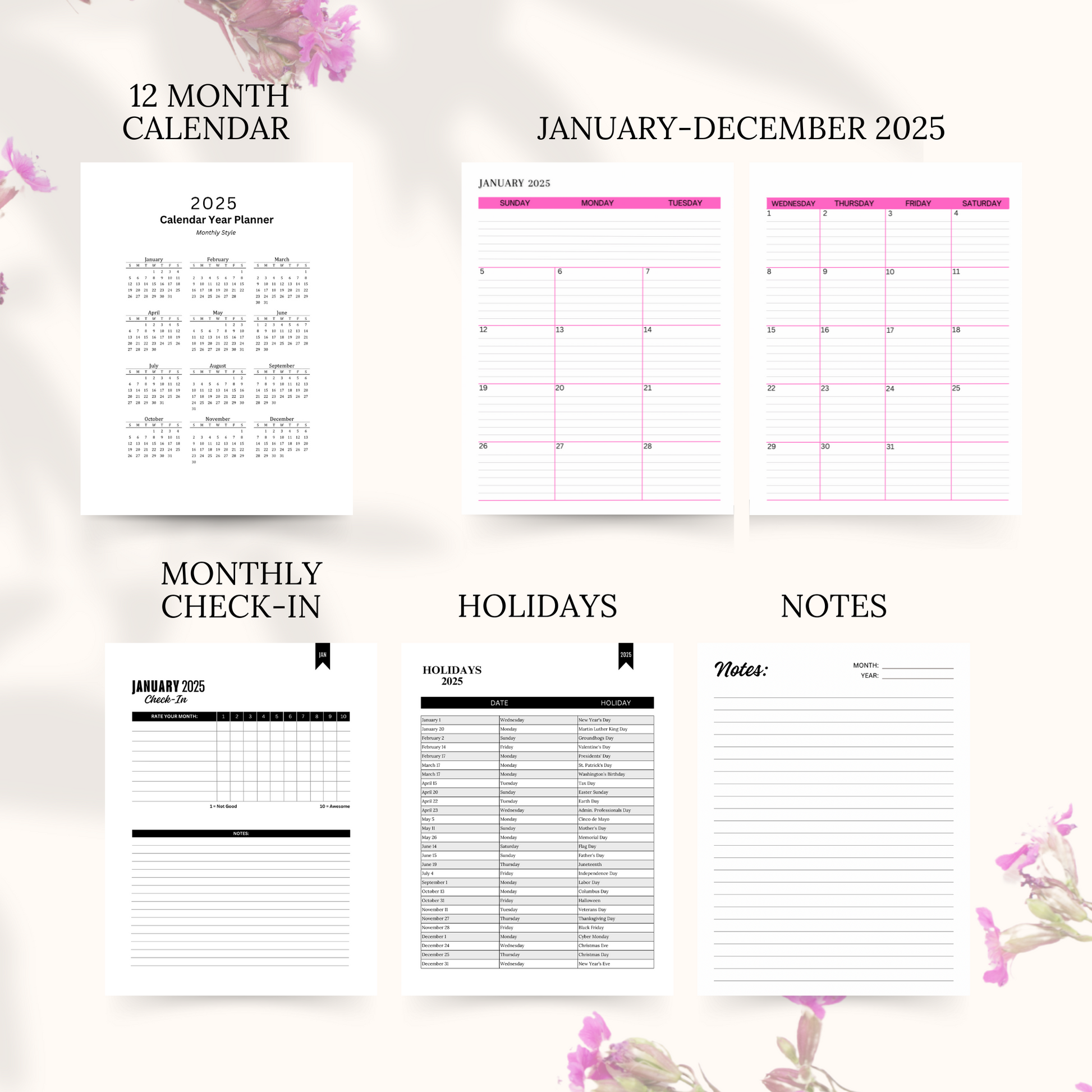 Stay organized and inspired all year long with this 2025 calendar, designed for functionality and style. Featuring a 12-month calendar layout, a dedicated holidays sheet, and thoughtfully placed check-in and notes pages between each month, it’s perfect for keeping track of your schedule, goals, and reflections.