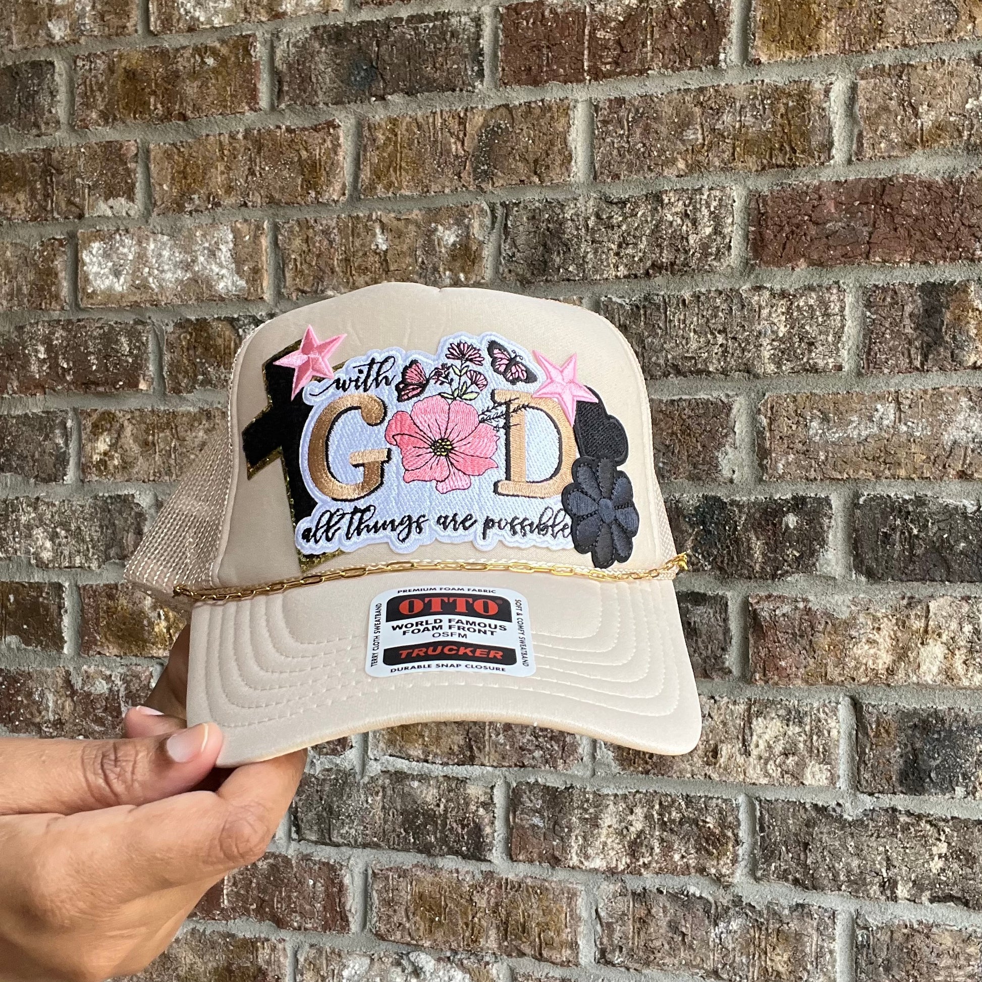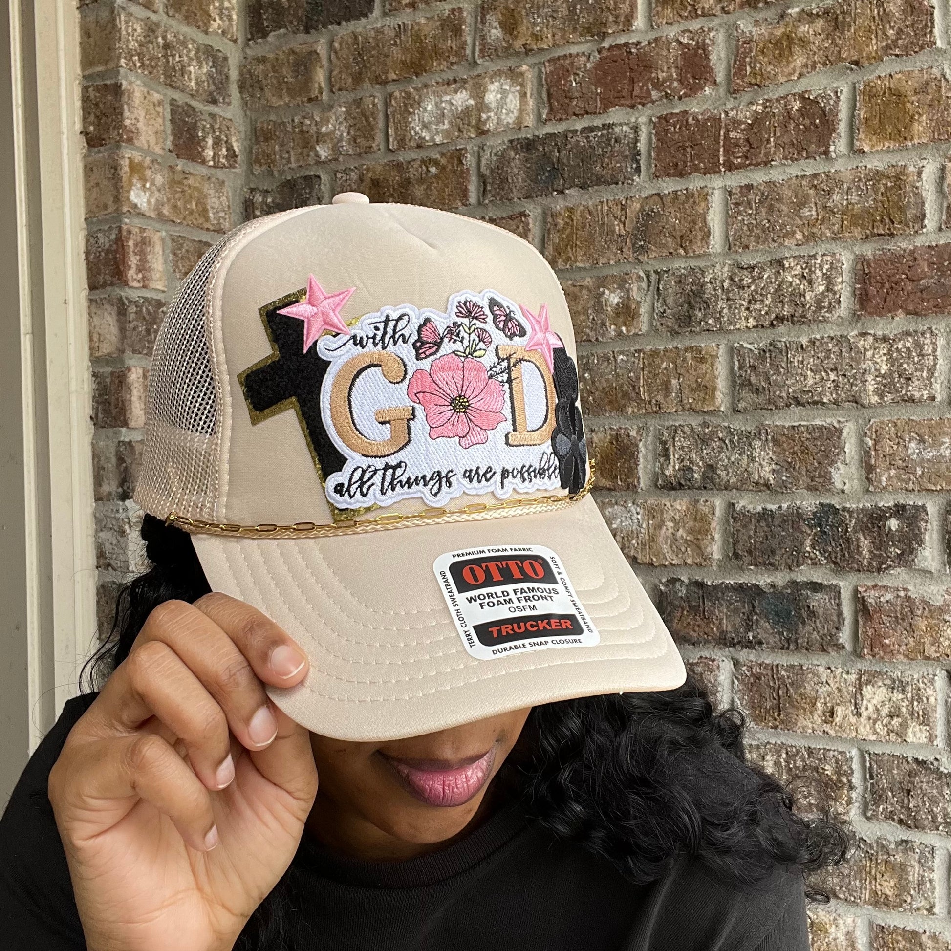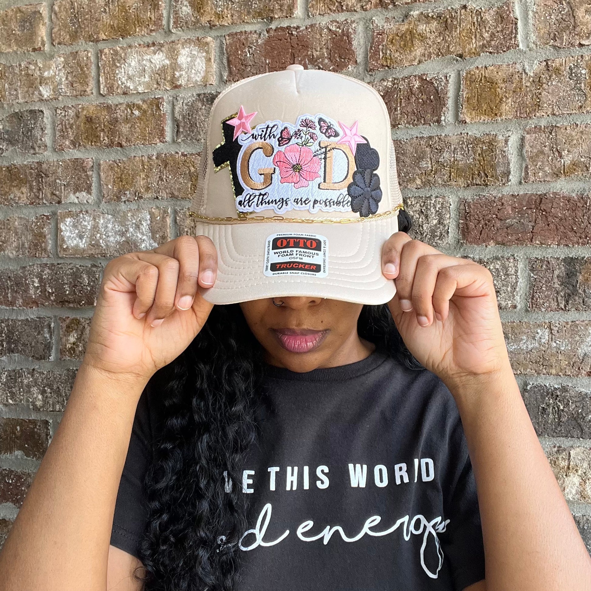 This tan Otto trucker hat isn’t just an accessory—it’s a statement of faith. Featuring the bold message “With God, All Things Are Possible” on a premium patch, this hat is designed to inspire confidence and trust in His plan. The added gold chain link detail brings a touch of elegance, making it the perfect blend of faith and fashion.