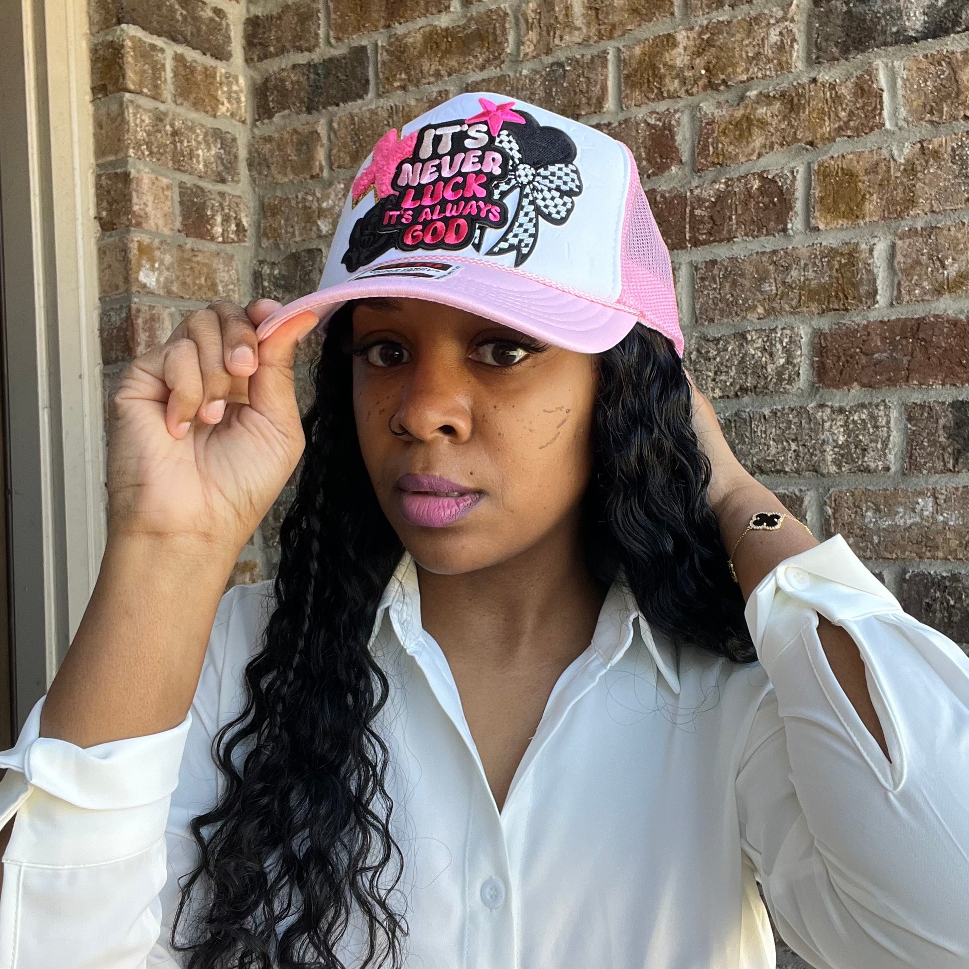 This trucker hat isn’t just an accessory — it’s a faith statement. Featuring bold patches with the reminder: It’s Never Luck, It’s Always God!